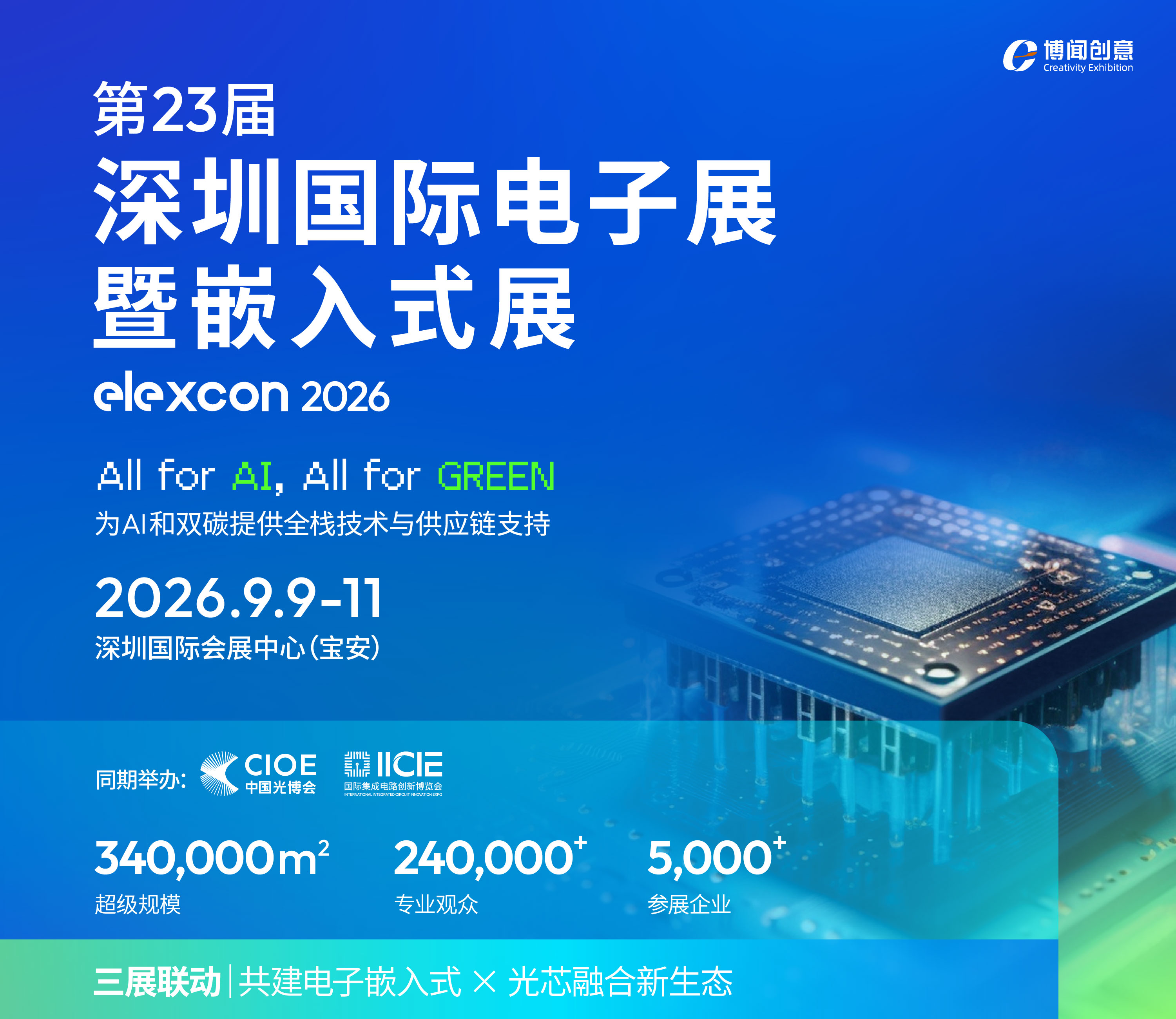 2026年9月9-11日,由博闻创意会展主办的 elexcon第23届深圳国际电子展暨嵌入式展 与 CIOE中国光博会、IC创新博览会将在深圳国际会展中心(宝安)同期举办。三展联动,总规模达 34 万平方米,共同打造新技术·新产品发布与推广首选平台。作为深圳及华南地区聚焦电子元器件与嵌入式技术的重要专业盛会,elexcon 2026将以 “All for AI,All for Green” 为主题,本届展会将重点展示芯片、存储、嵌入式与边缘 AI、电源与功率半导体、汽车电子、电子元器件及模块与方案 等核心板块;观众群体覆盖消费电子、汽车、通信、数据中心、医疗电子、工业控制、物联网 等领域的工程师、开发者、采购经理及技术决策者到场参观与交流。